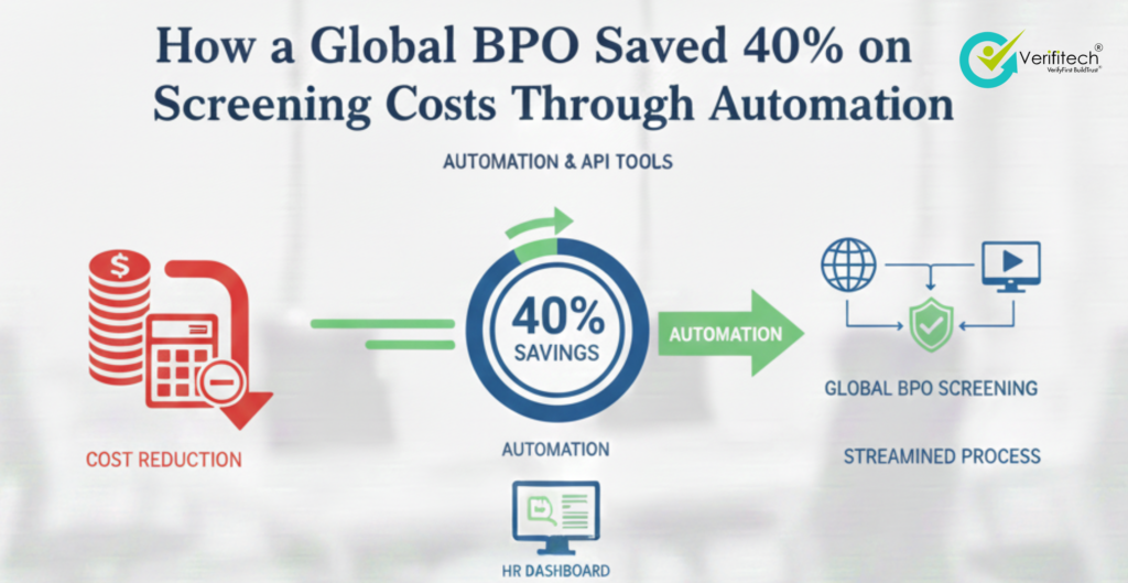 Client Overview A big company that does business operations for companies all around the world was hiring thousands of new employees every month. This company needed to do this to meet the demands of its clients. The company was growing fast.. There was a problem. The cost of checking thebackgrounds of employees was going up and it was taking a long time to verify everything. This was affecting the companys profits. How quickly it could get new employees started. The company was spending a lot of money on background checks for employees and it was taking too long to finish these checks. This was slowing down the process of getting employees on board. The company was a leading BPO with operations, in many regions and it was hiring thousands of employees every month. The Challenge The company really needed people to do a lot of things by hand. They had to depend on vendors to check things. This meant that they had problems with: High and unpredictable screening expenses Long turnaround times delaying candidate onboarding Limited visibility into verification status and costs Increased compliance and audit risks The Human Resources team and the operations team were looking for a way to do things that would work for a number of people. They wanted to find a solution that could help the Human Resources team and the operations team save money without making mistakes or breaking rules. The Human Resources team and the operations team needed this solution to be good, at keeping track of things and following the law. The Solution The BPO company put in place a computer system to check things automatically. This system brought together all the steps to check people into one process. The BPO solution made it possible to do a things. The BPO solution enabled the BPO to do these things The BPO made the whole process easier for the BPO The BPO is happy, with the system that the BPO is using. Automated identity, employment, and education verification Rule-based checks to eliminate redundant screenings Real-time dashboards for tracking progress and costs Seamless integration with existing HR systems The automation really helped to cut down on the work that people had to do and it also made sure that everything was done in the same way in all the different regions. This automation made things easier and more consistent for the automation, across all the regions. The Results Within six months of implementation, the impact was significant: 40% reduction in screening costs 65% faster verification turnaround time Improved candidate experience with real-time updates Enhanced compliance readiness with automated audit trails The results show that using BPO screening can save money. This is because the process is automated and the way it works is improved. The BPO screening savings are real. We can see them. The automated verification and smart process optimization are what make BPO screening savings happen. Business Impact The organization changed its screening process to make it more modern. This change turned background verification into a benefit for the organization of just a cost. The organization was able to get employees on board faster which helped them meet the requirements of their clients. At the time the cost of screening went down which directly improved the organizations profitability. This is an example of how the organization was able to reduce its human resources costs and it is especially useful, for companies that do a lot of hiring. The background verification process is a part of the organizations human resources and making it more efficient is a big part of reducing human resources costs. Key Takeaway Automation isn’t just about speed it’s about control, visibility, and sustainable growth. For BPOs managing high-volume hiring, automated verification can deliver meaningful cost savings without compromising trust or compliance.